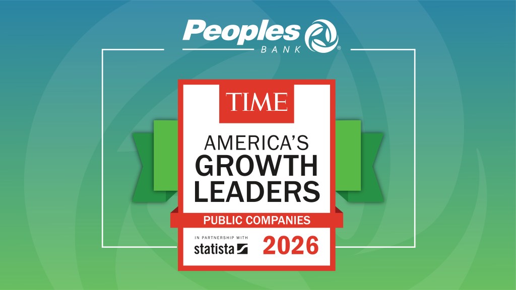 January 2 – Peoples Bank is proud to share that it has been named to TIME‘s America’s Growth Leaders of 2026. Created by TIME and Statista, this inaugural list recognizes top-performing U.S. companies for strong revenue growth and long-term financial stability. This honor reflects our commitment to sustainable growth, innovation and serving our clients and communities for the future.